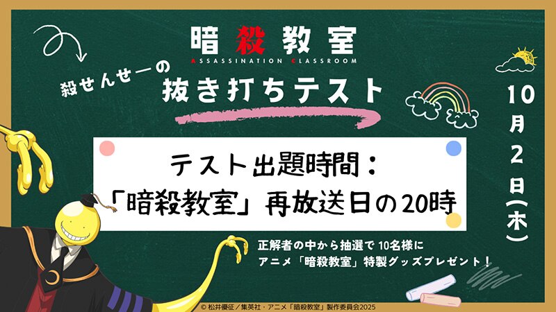 テスト問題は毎週木曜日20:00にアニメ「暗殺教室」公式Xに投稿いたします。